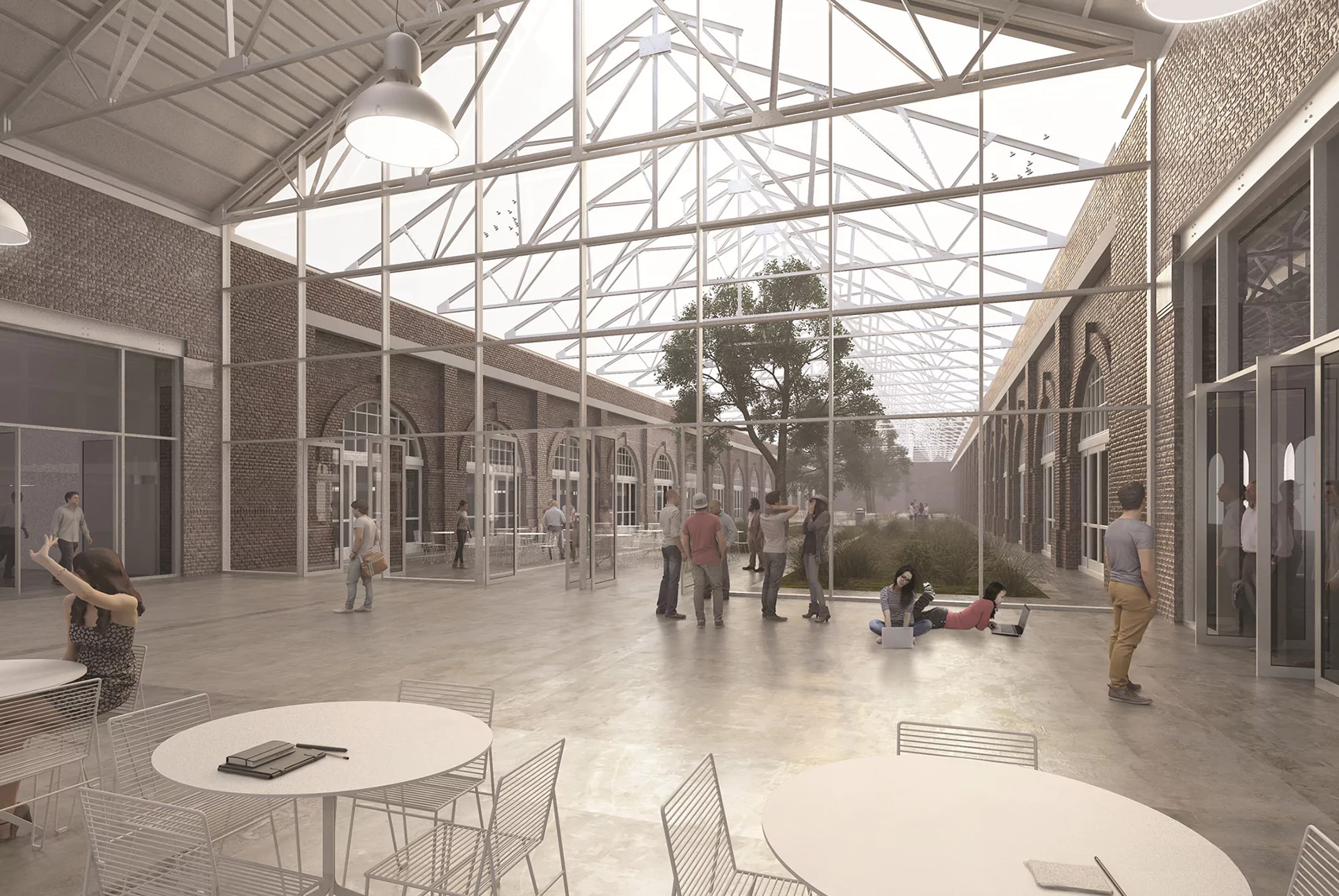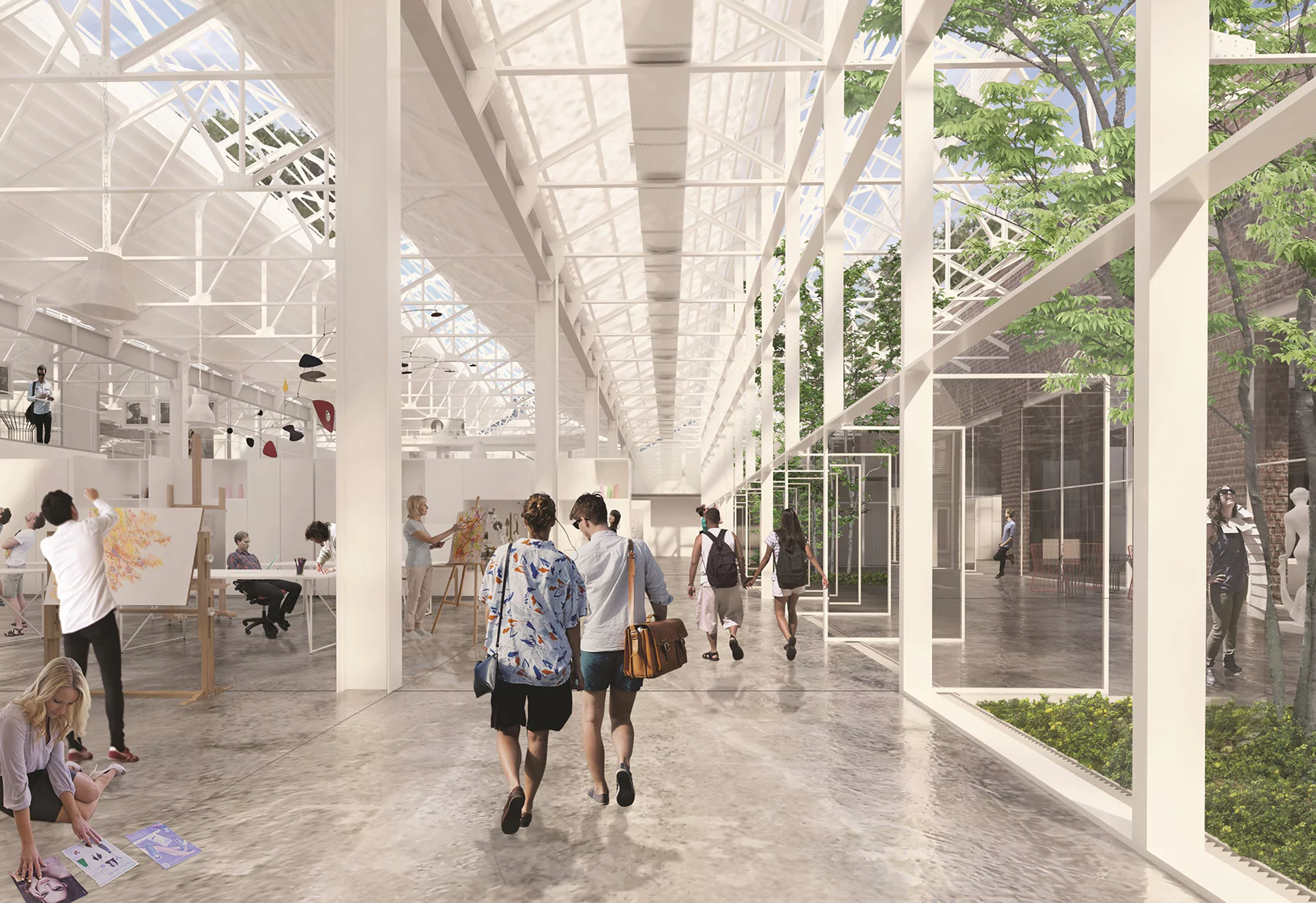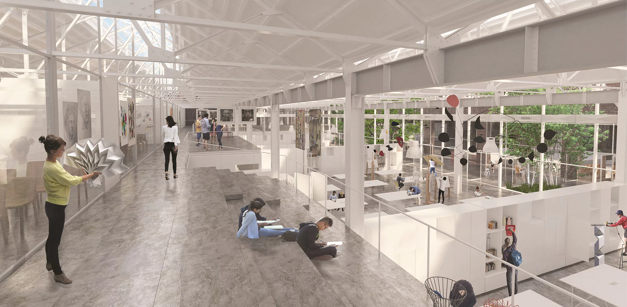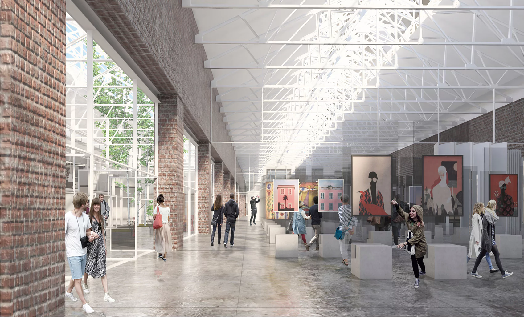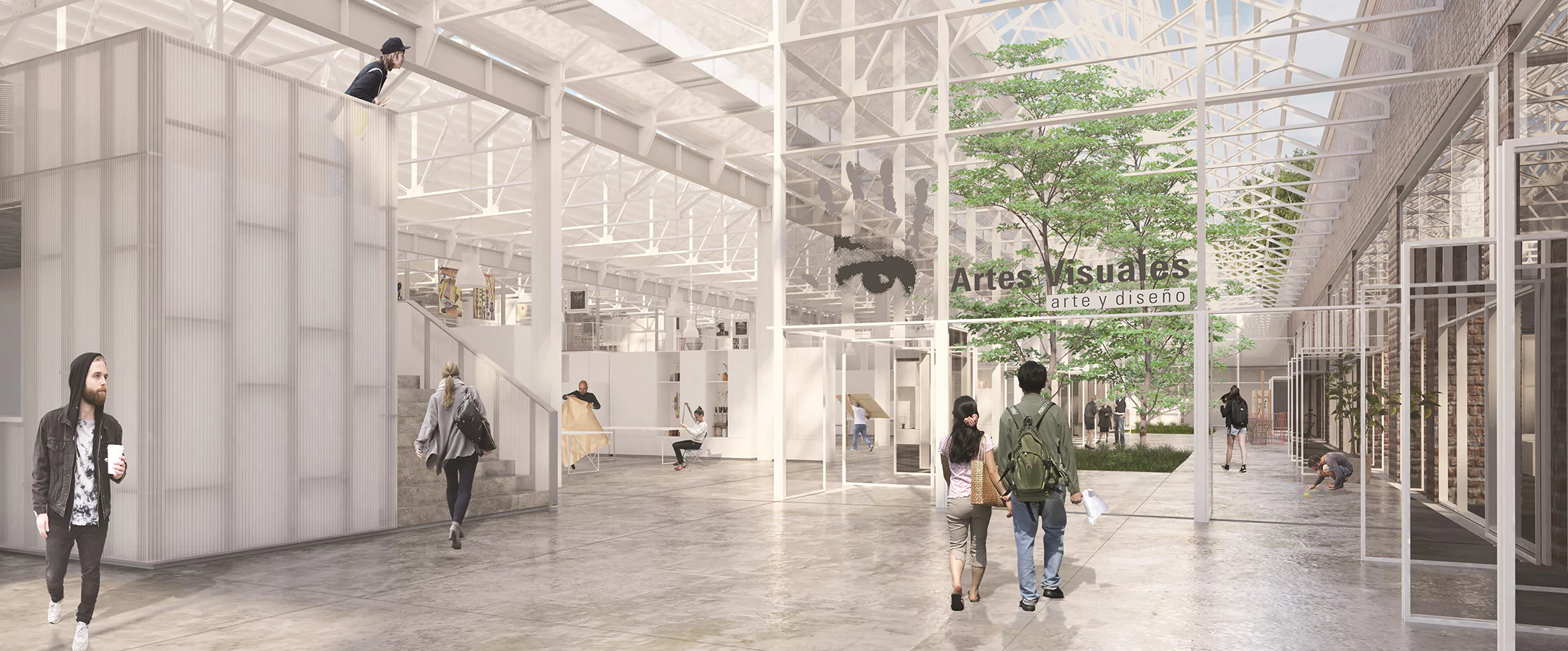 La propuesta espacial parte de la generación de un vacío obre la nave donde la Escuela Provincial de Artes Visuales y el Centro Comunitario se conectan y relacionan, y a su vez producen flexibilidad de usos.