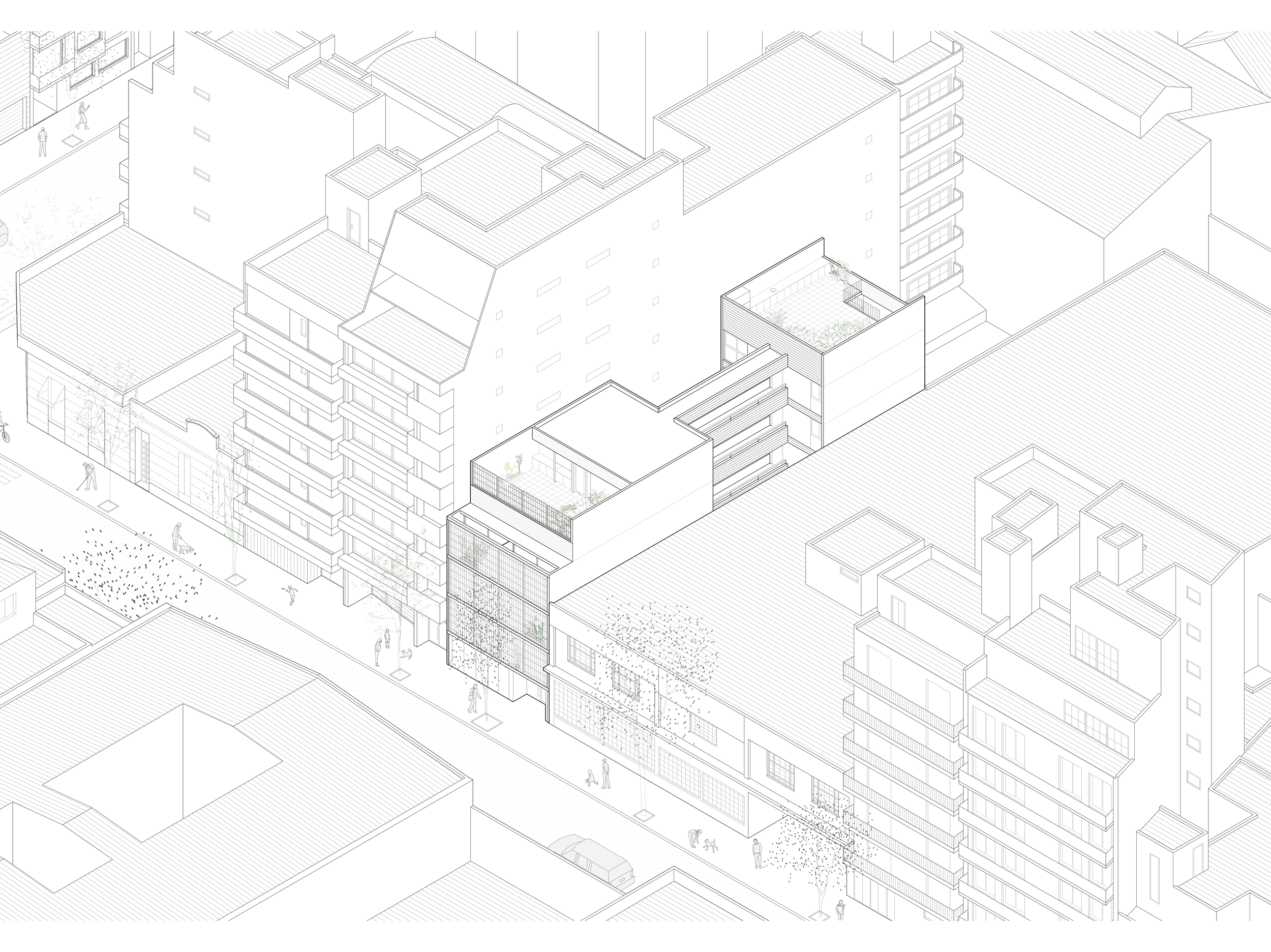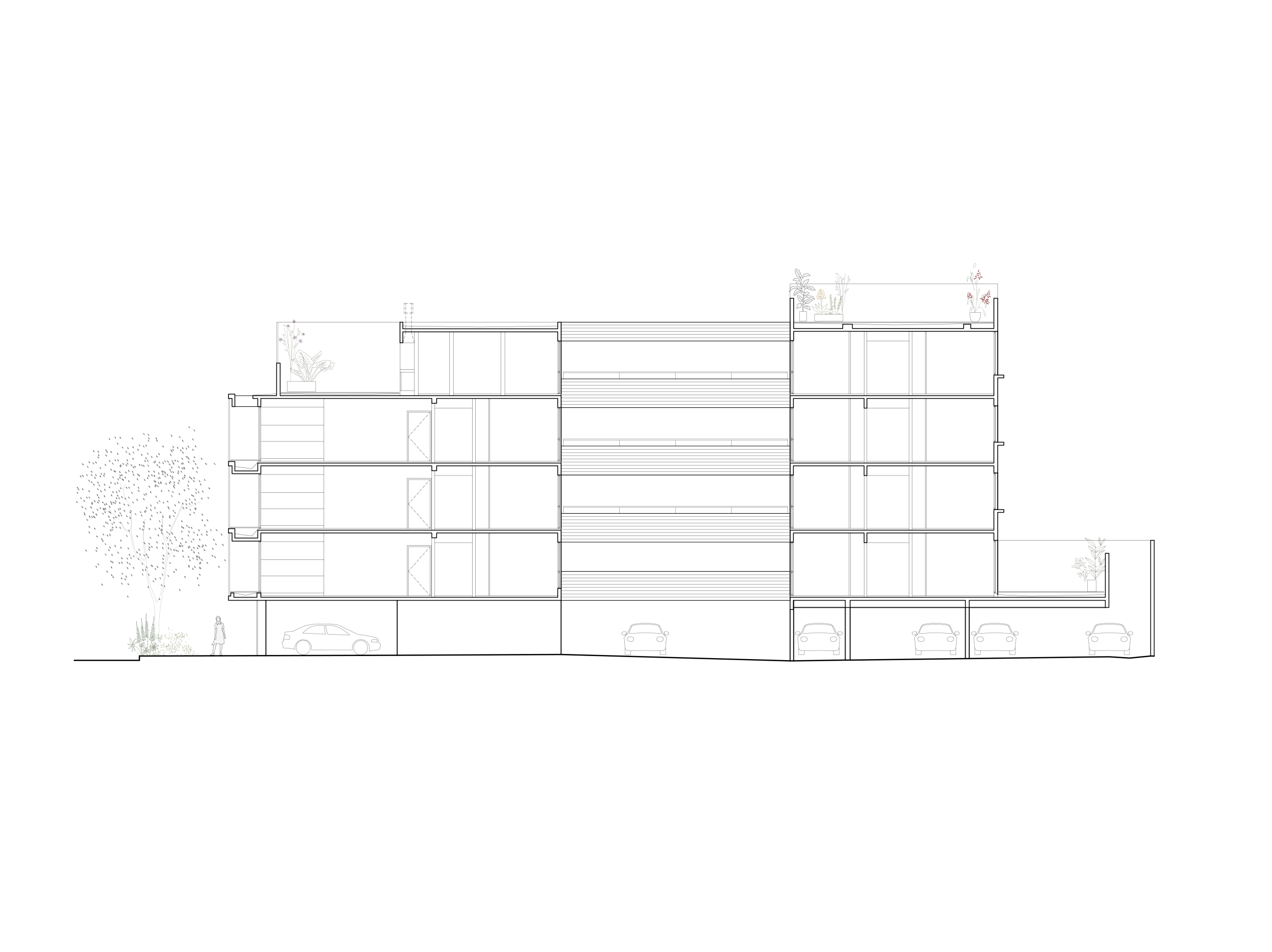 Cada nivel se organiza en dos volúmenes. Al frente con una vivienda de dos ambientes y una de un ambiente y al contrafrente se ubica una de tres ambientes. El tres ambientes del primer piso posee un gran patio a nivel, mientras que el del 4to piso incorpora el acceso privado a la terraza.