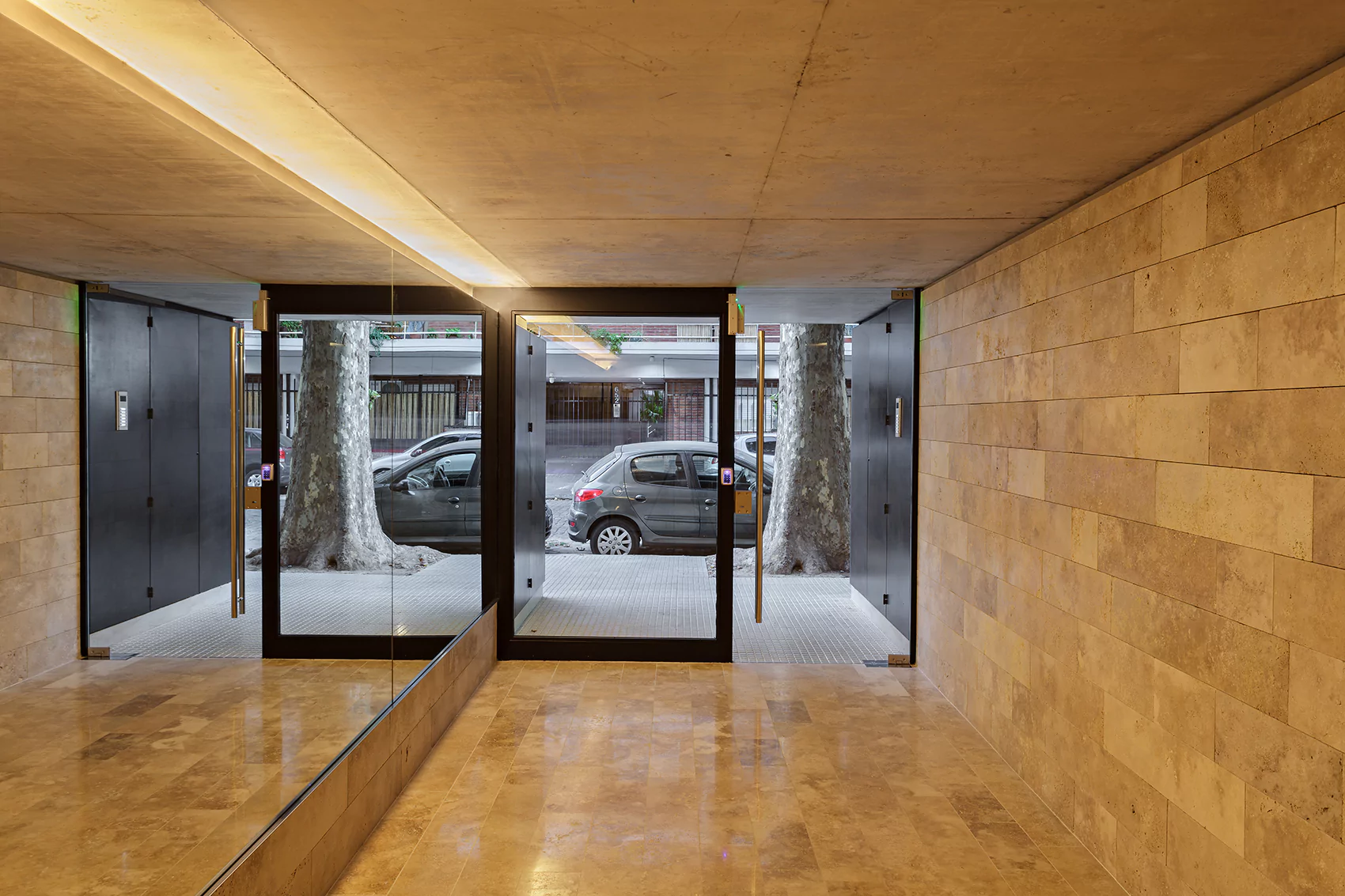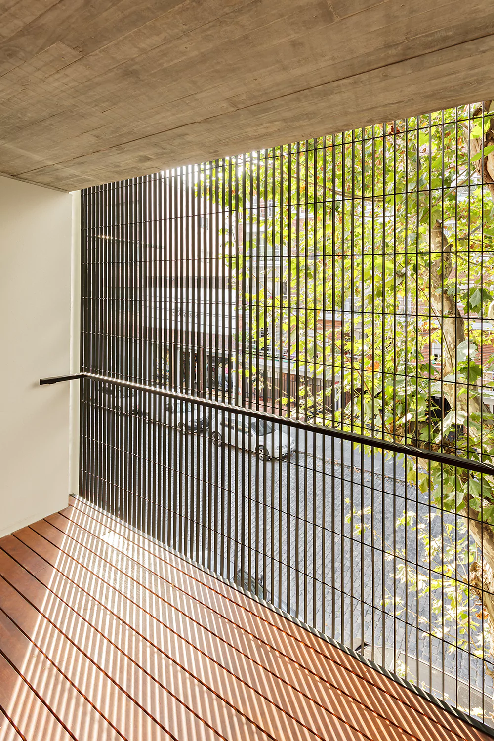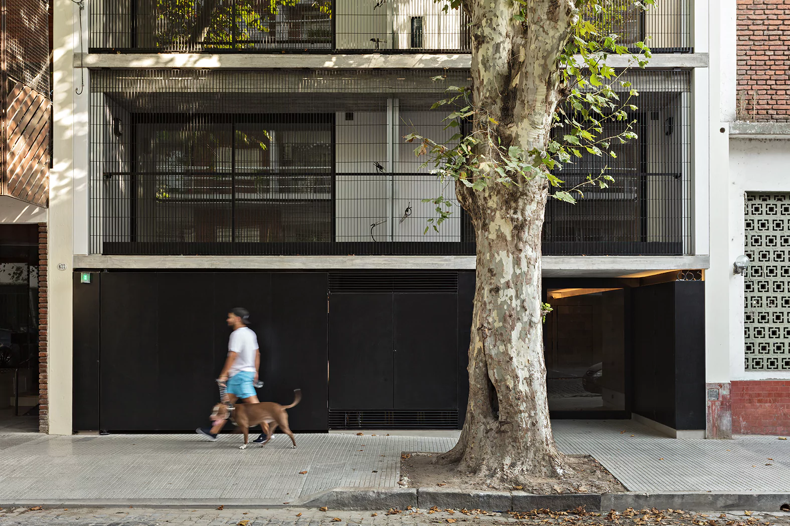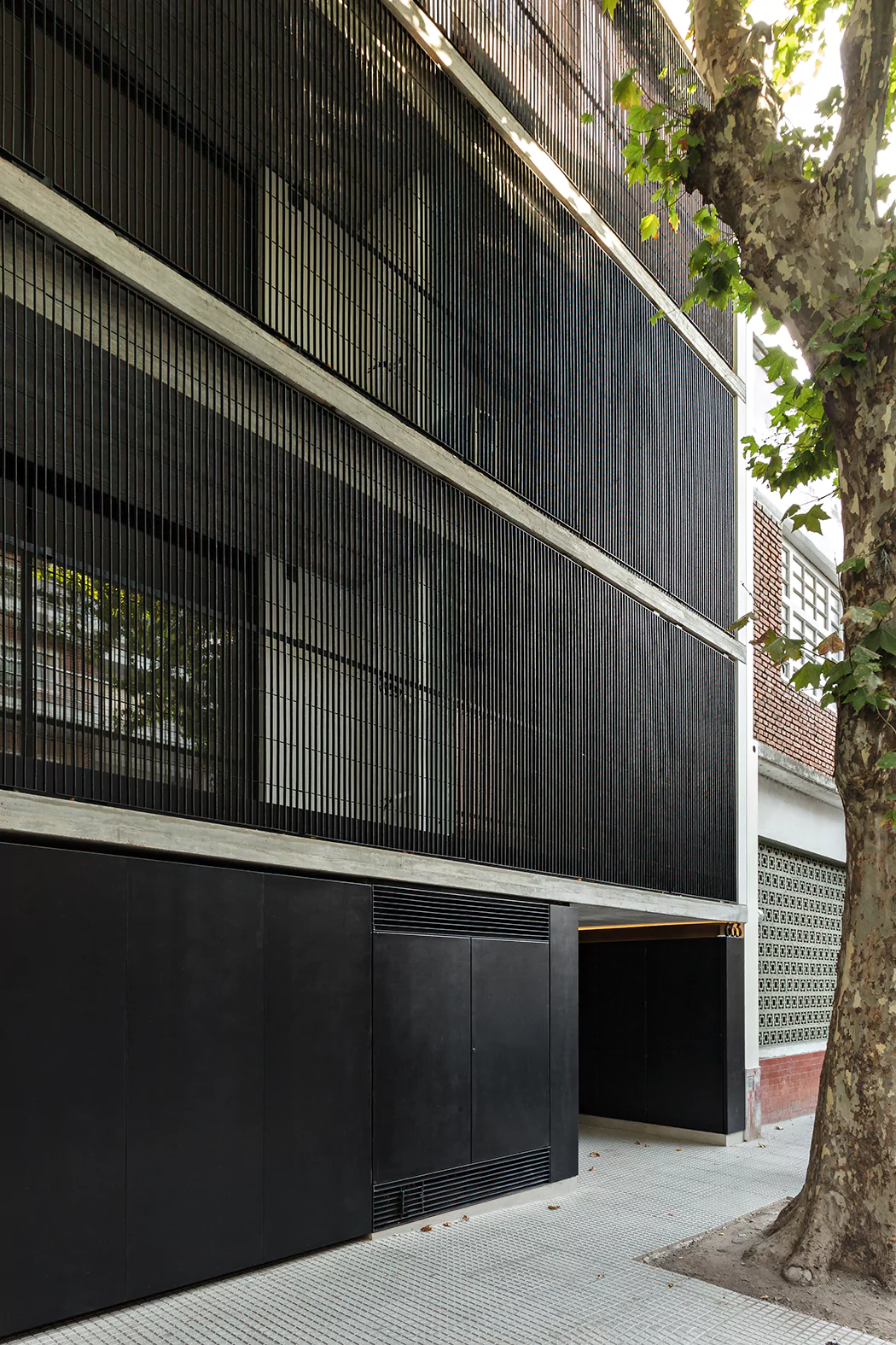 La fachada se resolvió con una malla permeable compuesta por planchuelas verticales que generan desde el exterior la sensación de movimiento a medida que se acerca o aleja del edificio. Hacia el interior, da distintas permeabilidades, manteniendo la privacidad de los departamentos y dando transparencias hacia la calle. Resulta dinámica ya que va cambiando según el punto de vista, y funciona como un filtro y control solar hacia el noroeste.
