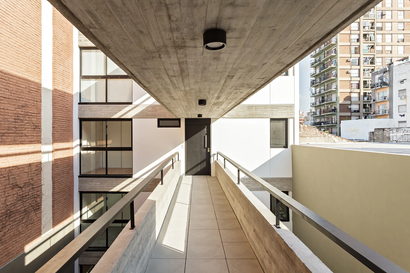 Los dos volúmenes están unidos por puentes que cubren 10m de luz sin apoyos generando palieres abiertos semicubiertos de acceso a las unidades. Este patio da iluminación y ventilación a los departamentos y espacios comunes.