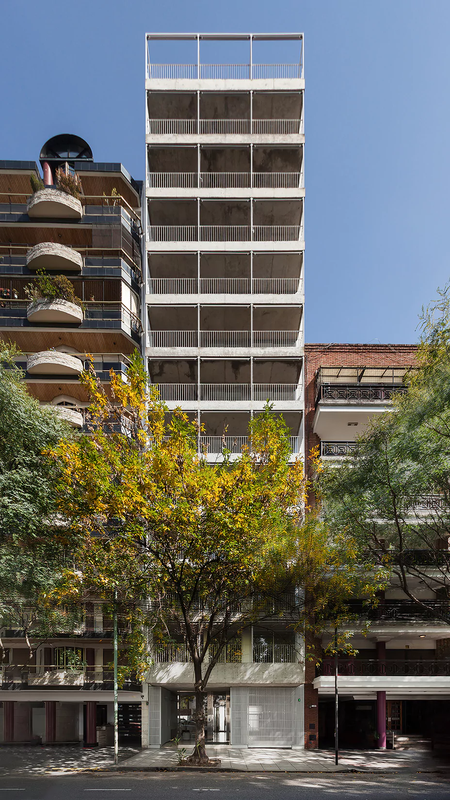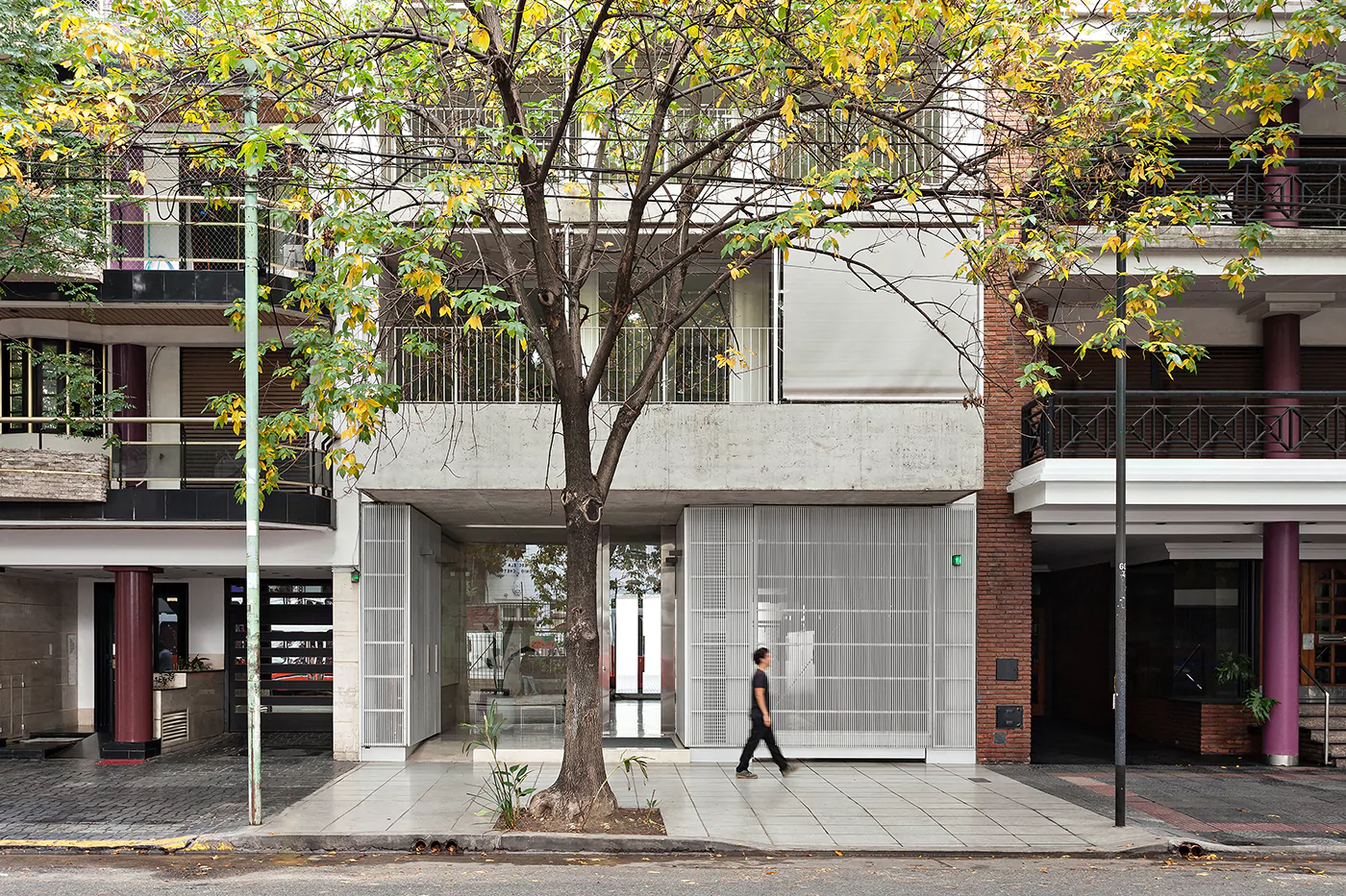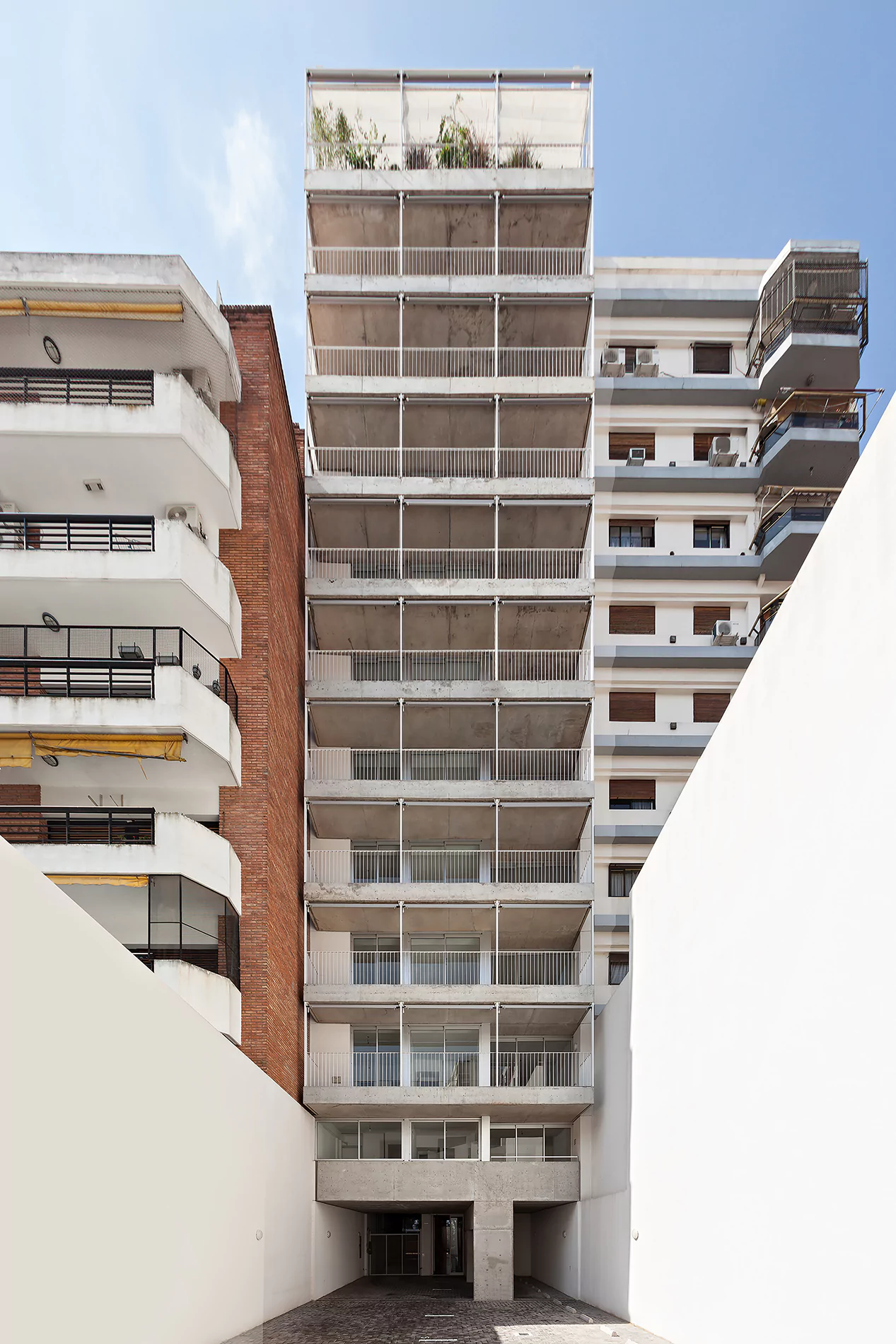 La estructura de hormigón visto resuelve los espacios comunes de planta baja y expansiones de todo el edificio como postura silenciosa y austera en relación al barrio y a la ciudad.