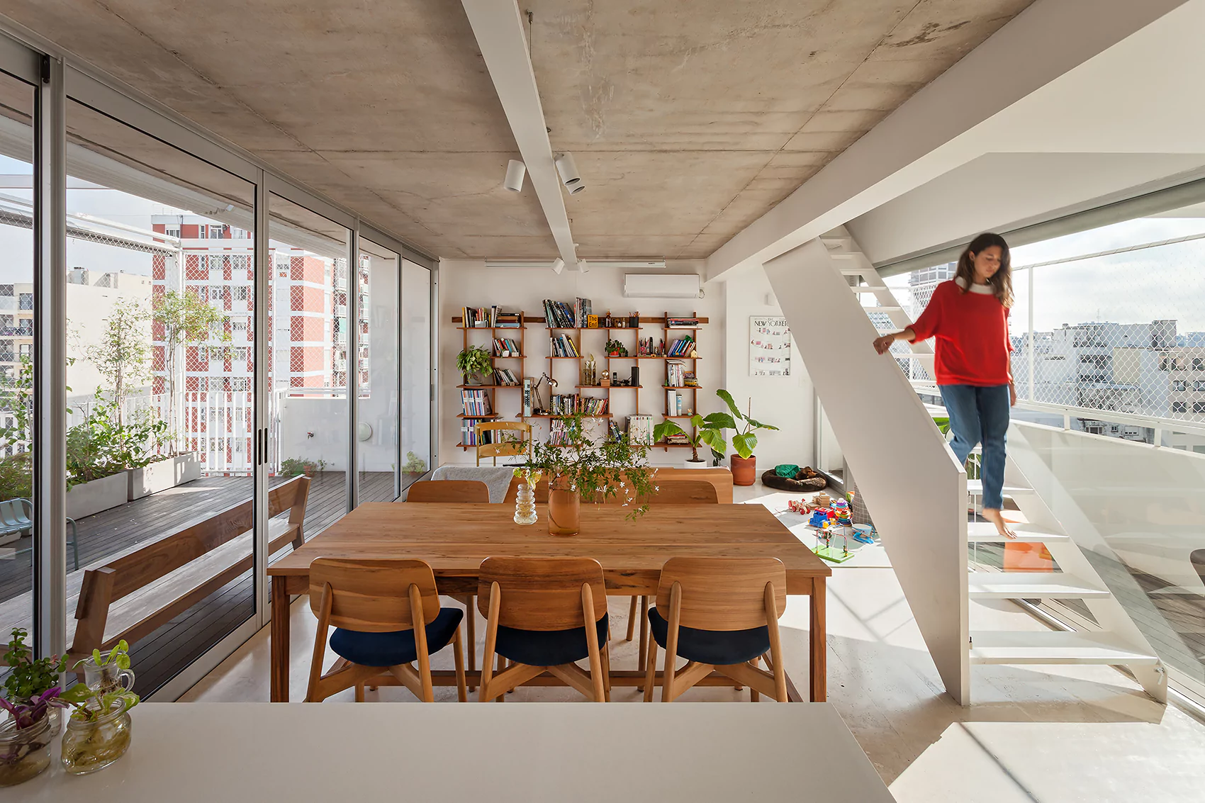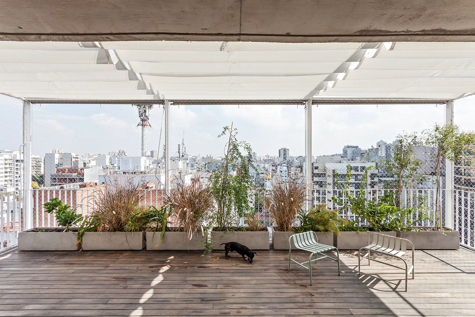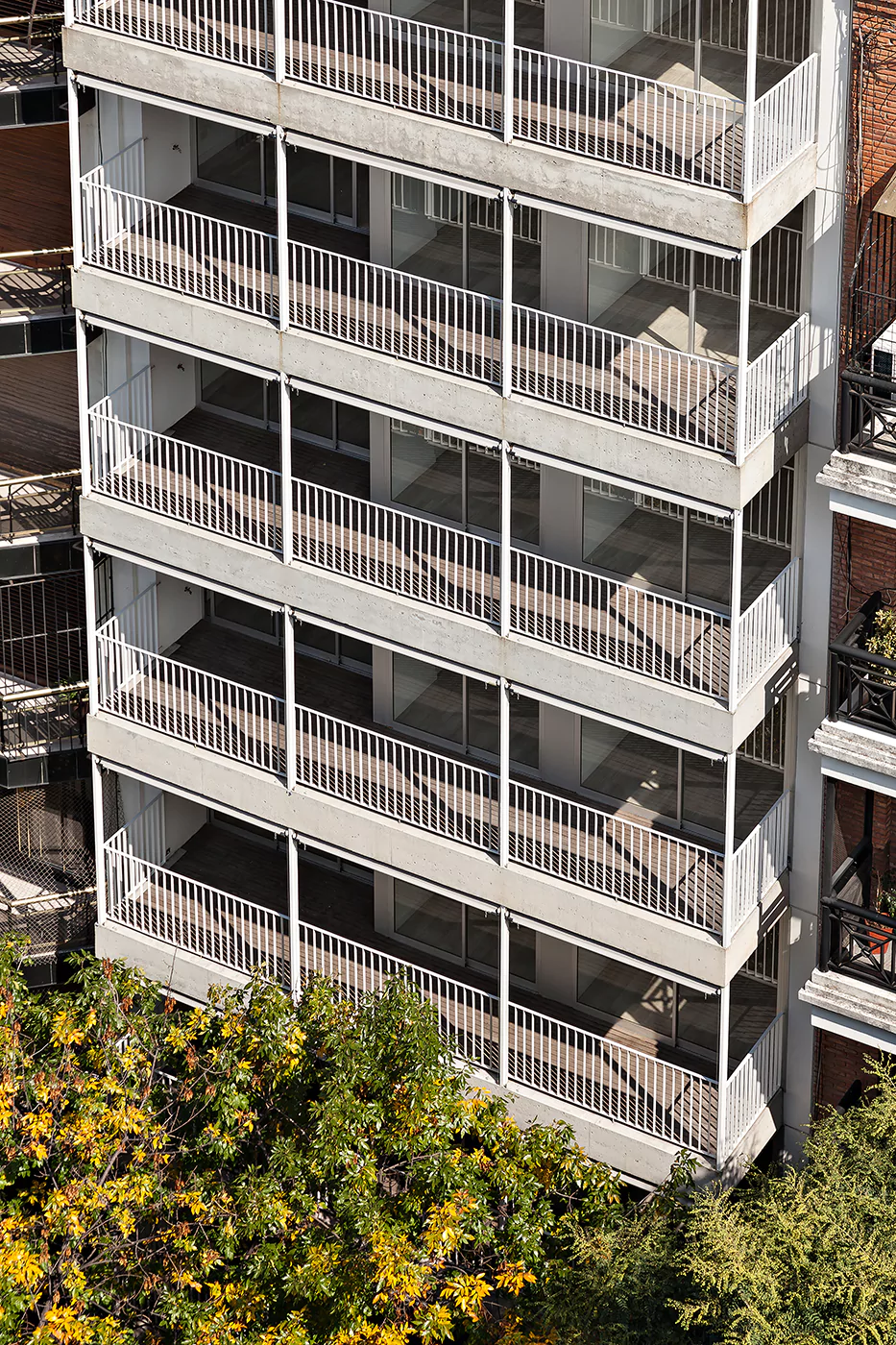 La estructura de hormigón visto resuelve los espacios comunes de planta baja y expansiones de todo el edificio como postura silenciosa y austera en relación al barrio y a la ciudad.