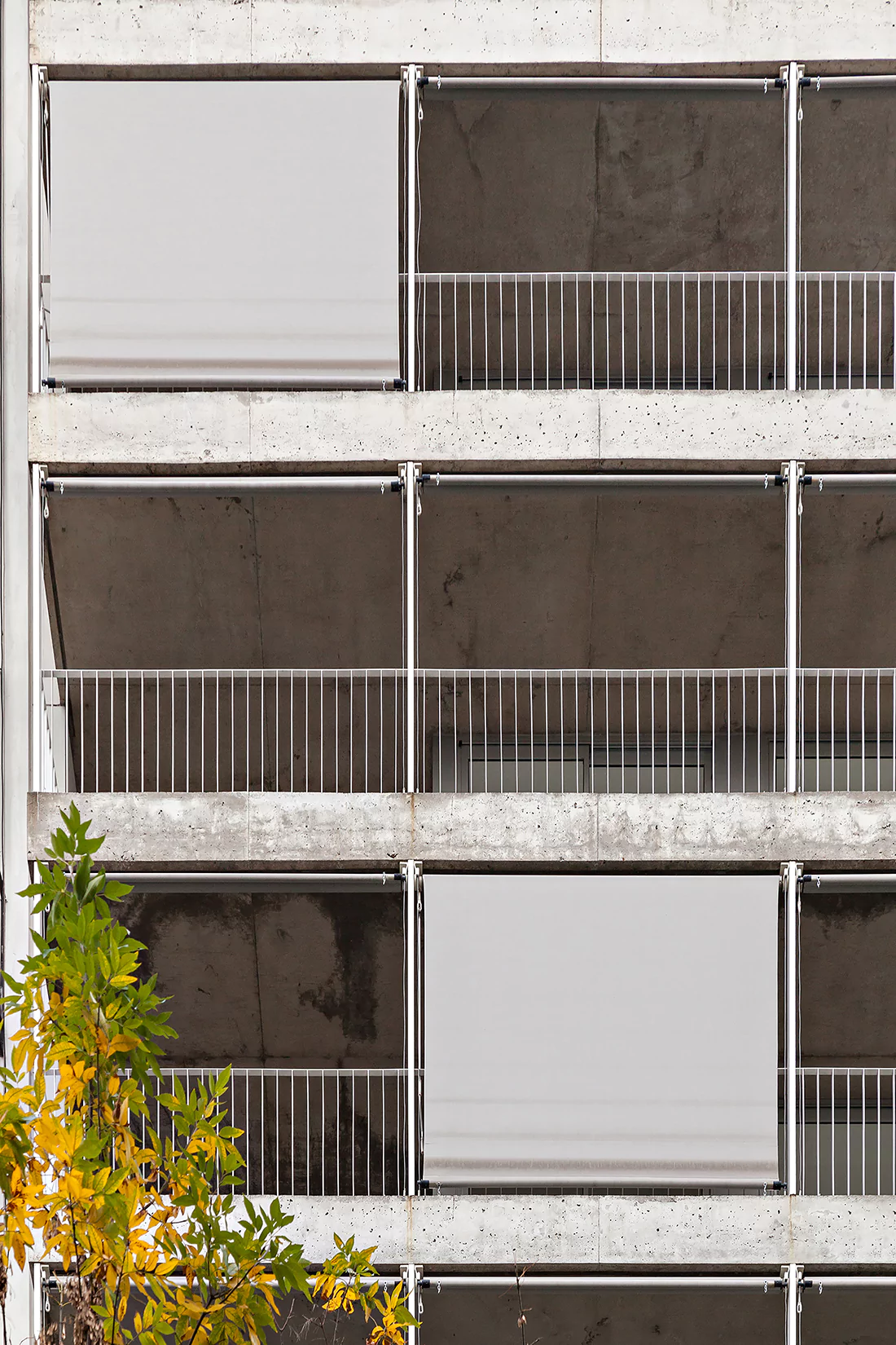 Orientadas este-oeste, las fachadas incorporan un sistema de toldos verticales de tela microperforada otorgando diferentes ambientes y privacidad a las expansiones, satisfaciendo la propuesta energética del conjunto y disminuyendo gastos de mantenimiento.