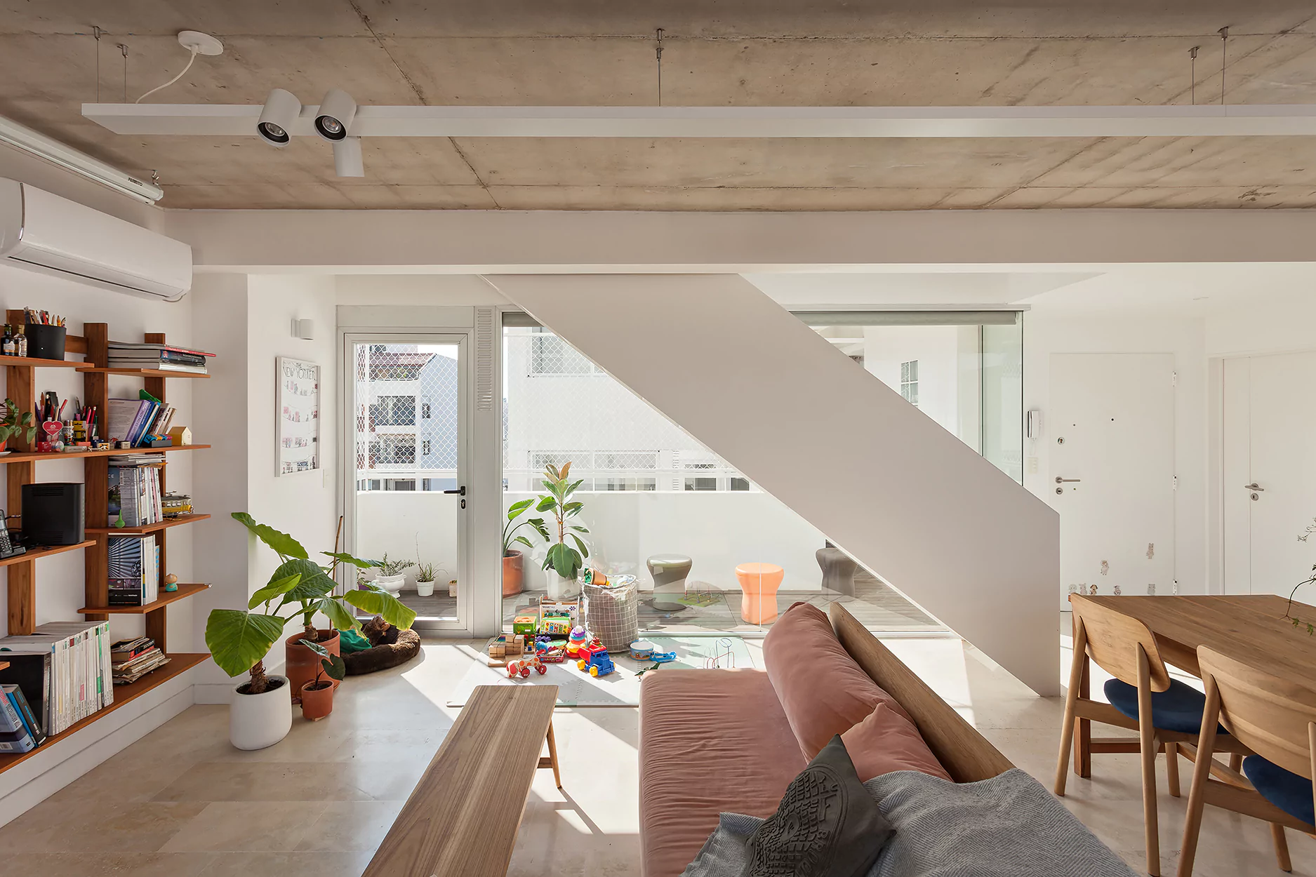 Las viviendas se articulan a través del núcleo circulatorio y de un vacío que habilita su iluminación y ventilación. El bloque de viviendas del frente se dispone a medio nivel respecto de las unidades del contrafrente. De tal modo se consigue mayor privacidad entre las mismas.